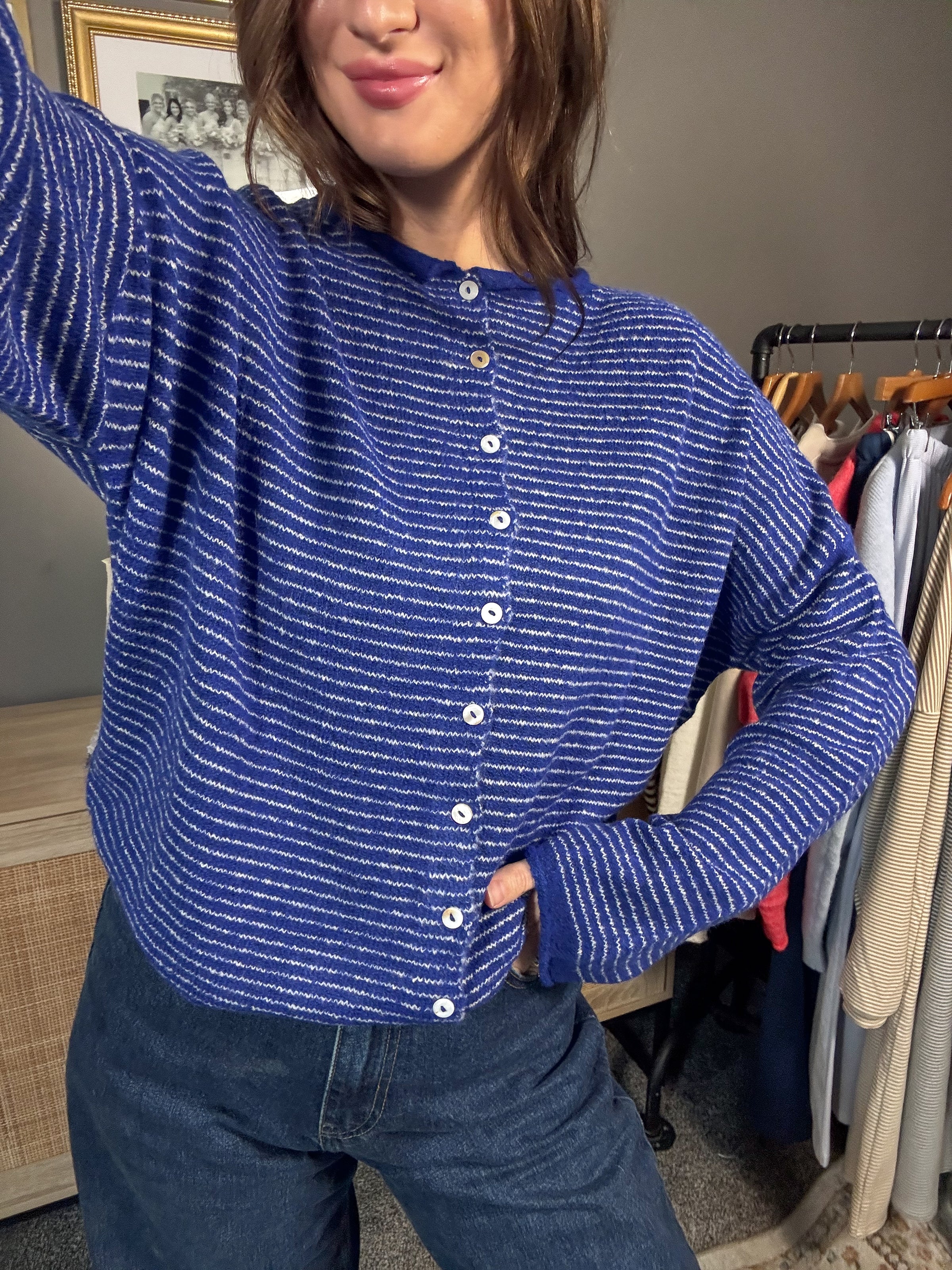 The Pin Stripe Piper Cardigan is made for the girl who wants to be comfy but still look styled. It’s oversized in the best way — relaxed, slouchy, and cozy without swallowing you — with soft dusty blue fabric and classic pin stripes that give it just enough detail to feel elevated (not basic).