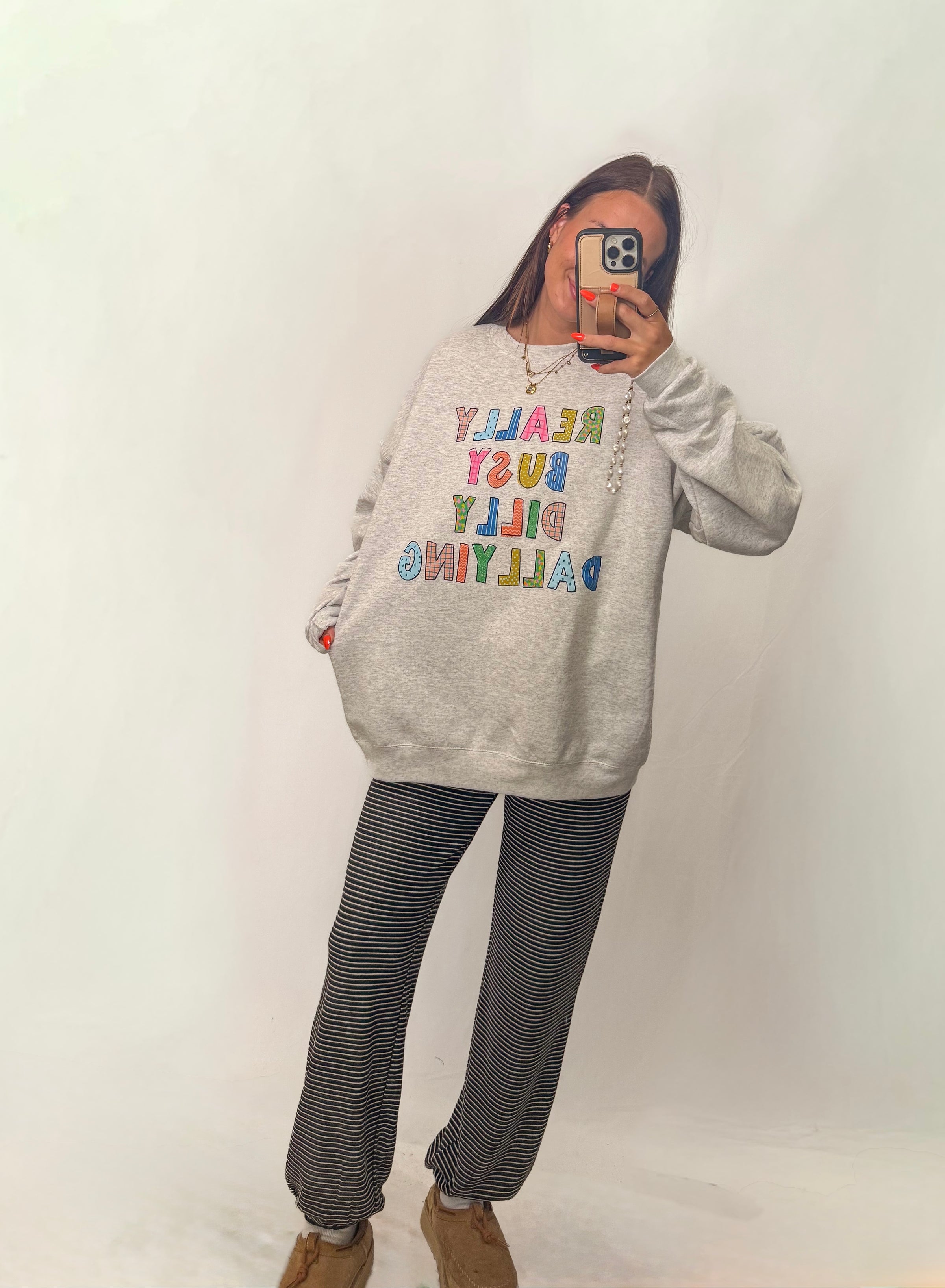 A playful essential for your wardrobe — this sweatshirt features colorful lettering that reads “Really Busy Dilly Dallying” across the front. Made with a relaxed, oversized fit, it’s the perfect mix of cozy and cheeky.