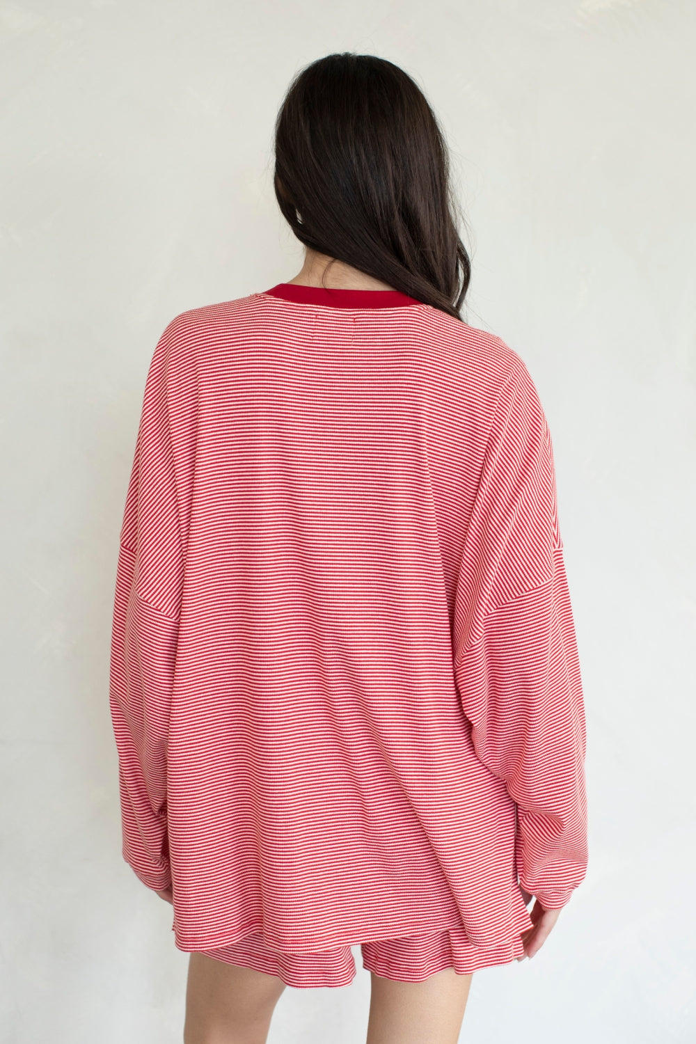 Made from a breathable ribbed cotton blend (95% cotton, 5% spandex), it has that relaxed, true-to-size oversized fit with a drapey feel that hangs just right. Loose sleeves, extra room through the body, and the subtle stripe texture give it that elevated lounge look you can actually leave the house in.