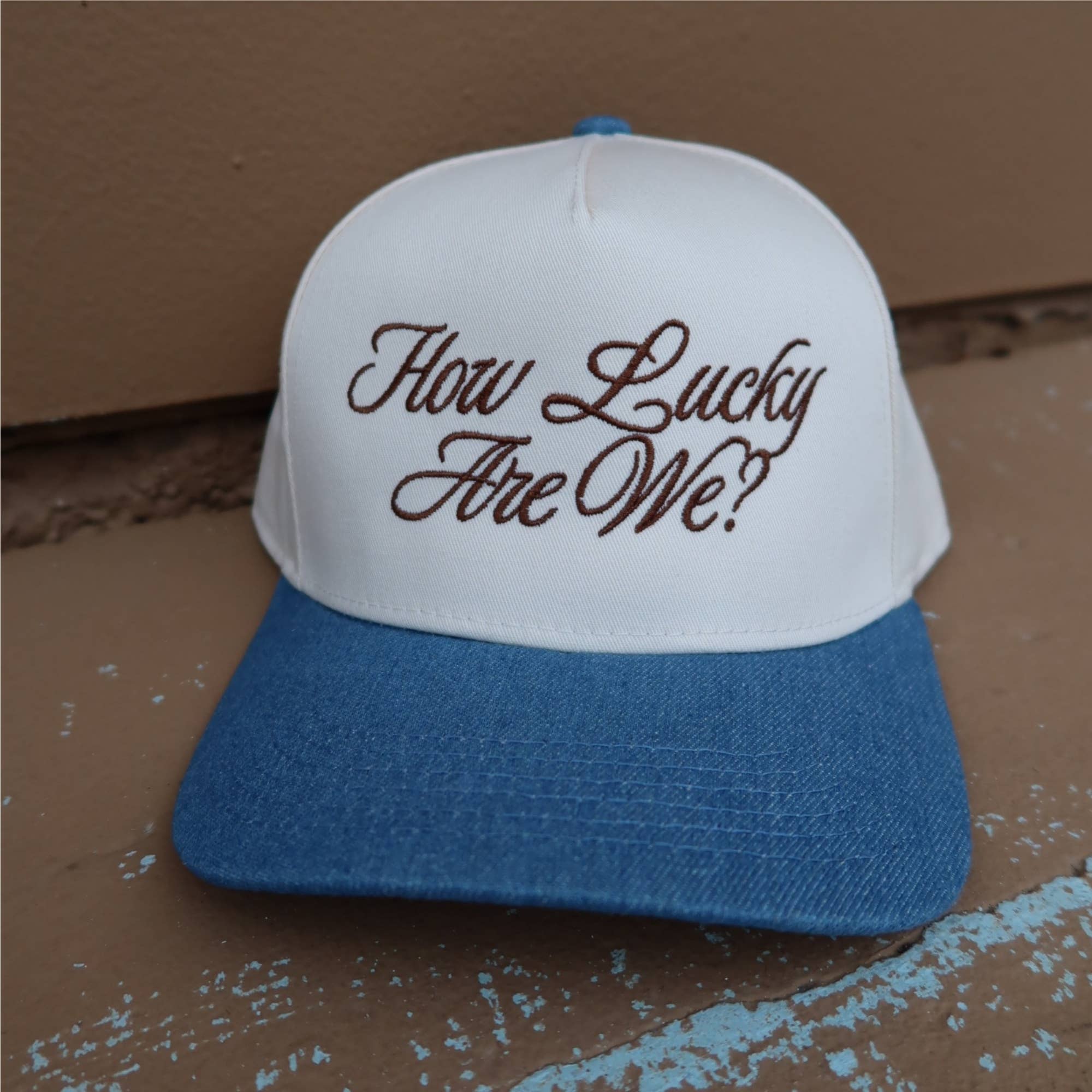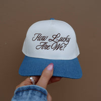 How Lucky Are We? Denim/Natural Vintage Trucker Hat with Brown embroidered design