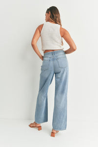 Comfortable, wide legs offset the structure of a no-stretch waist band on these extra trendy dad jeans for summer. This pair features distressing and a full-length leg. In a light denim wash.