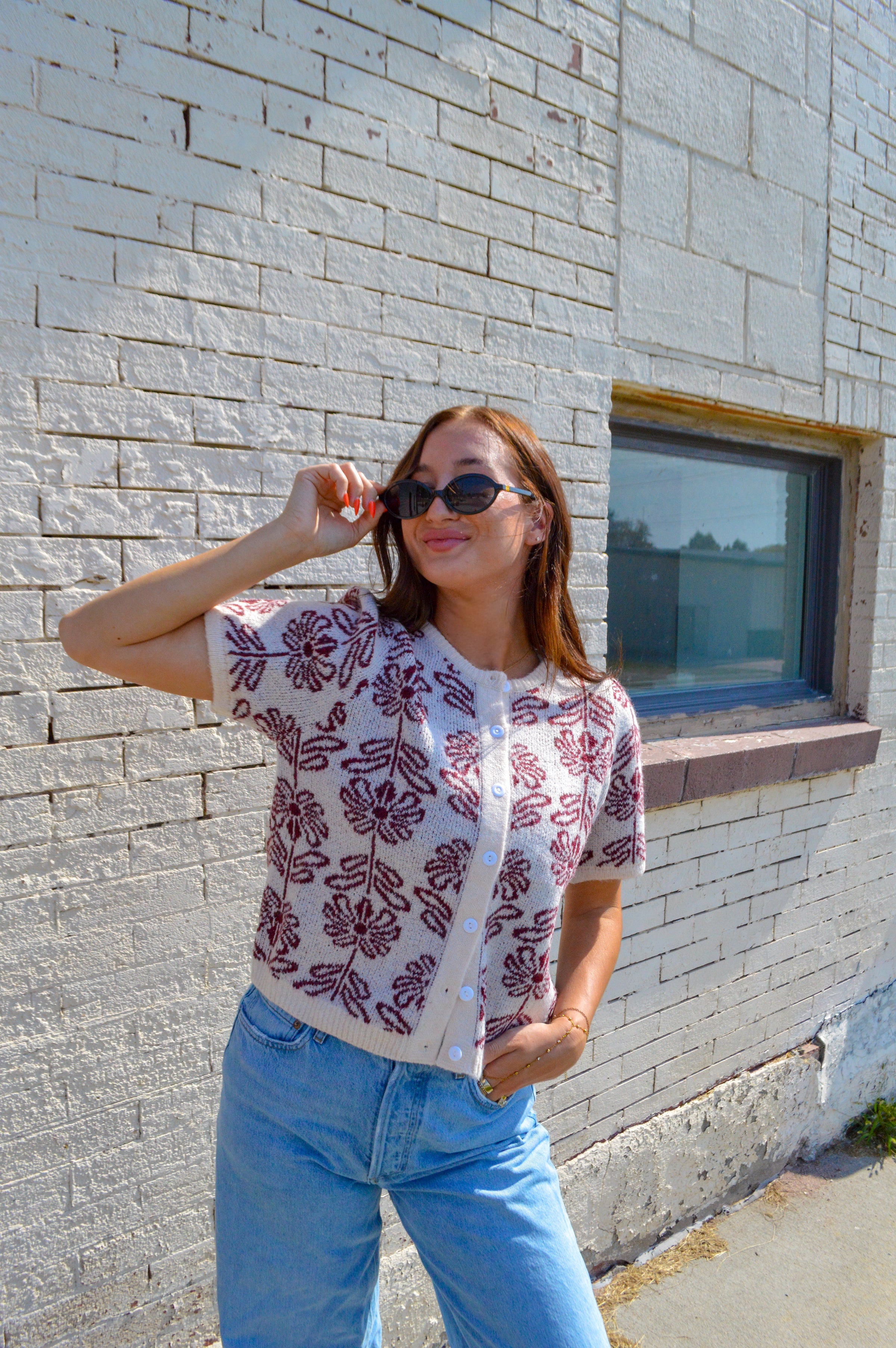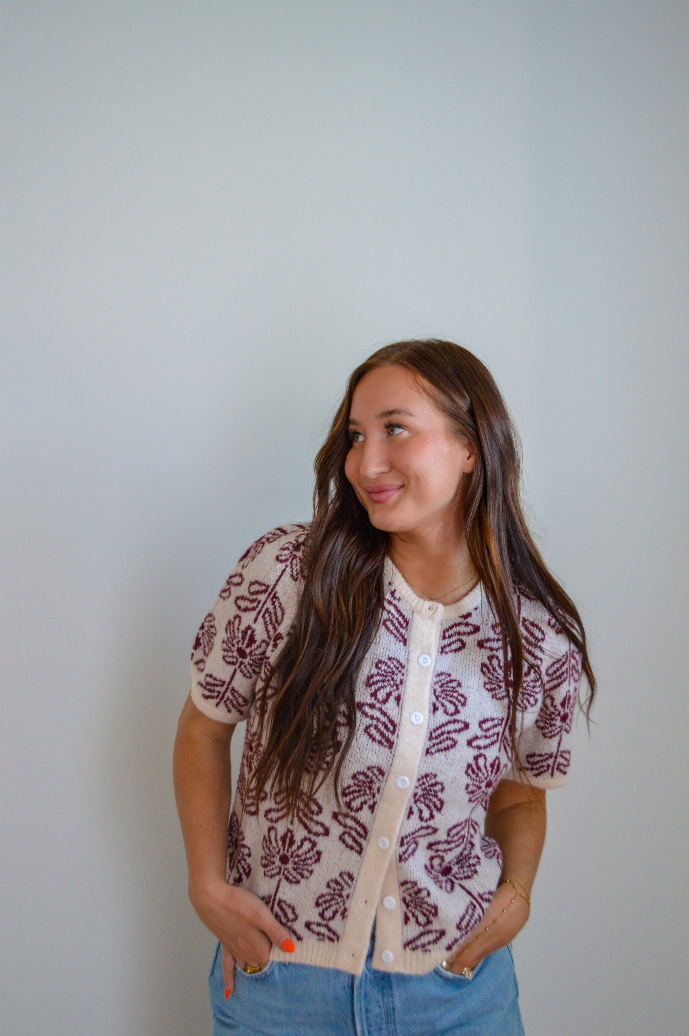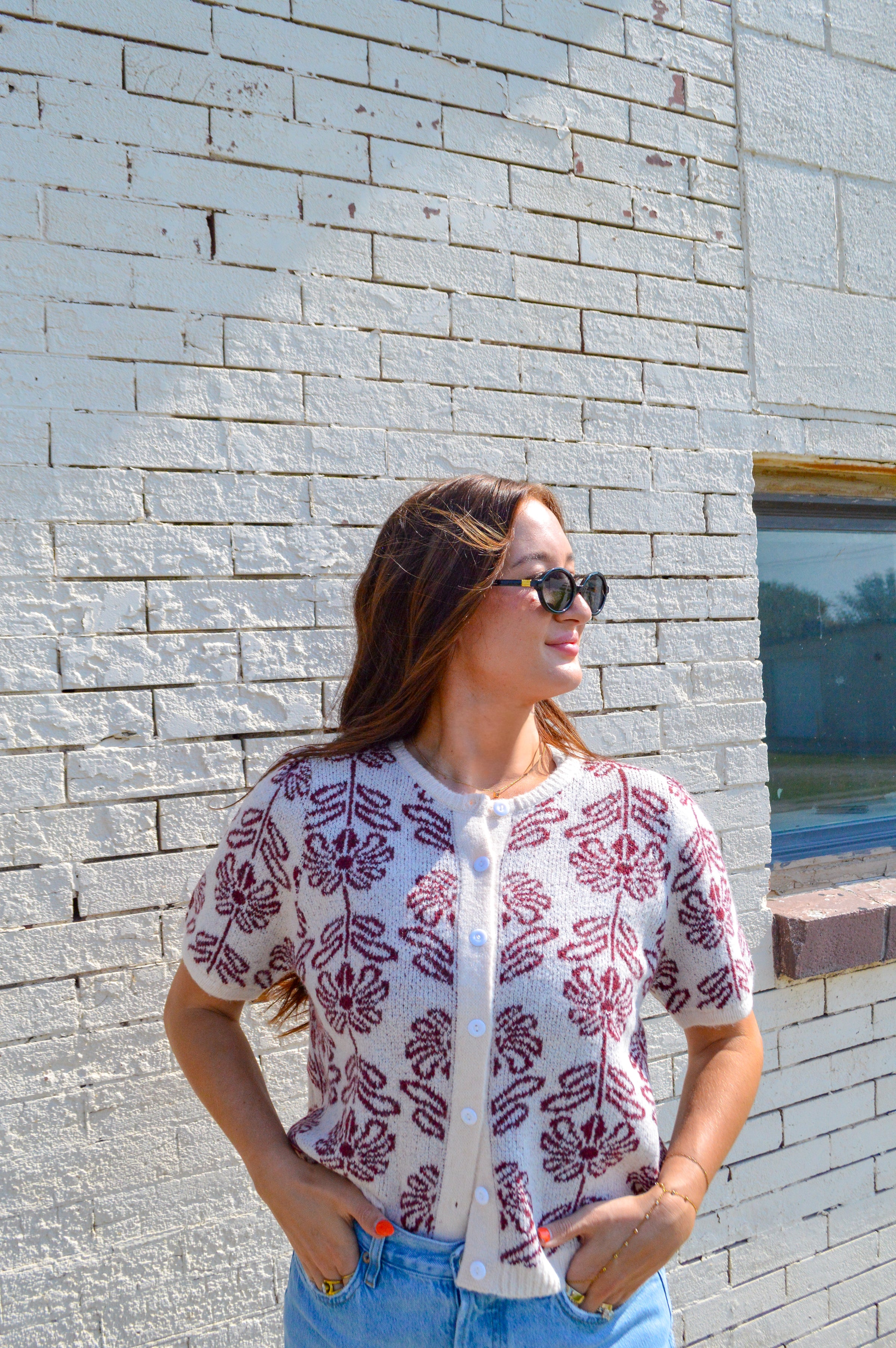 A sweet floral knit cardigan with the perfect mix of cozy and feminine.