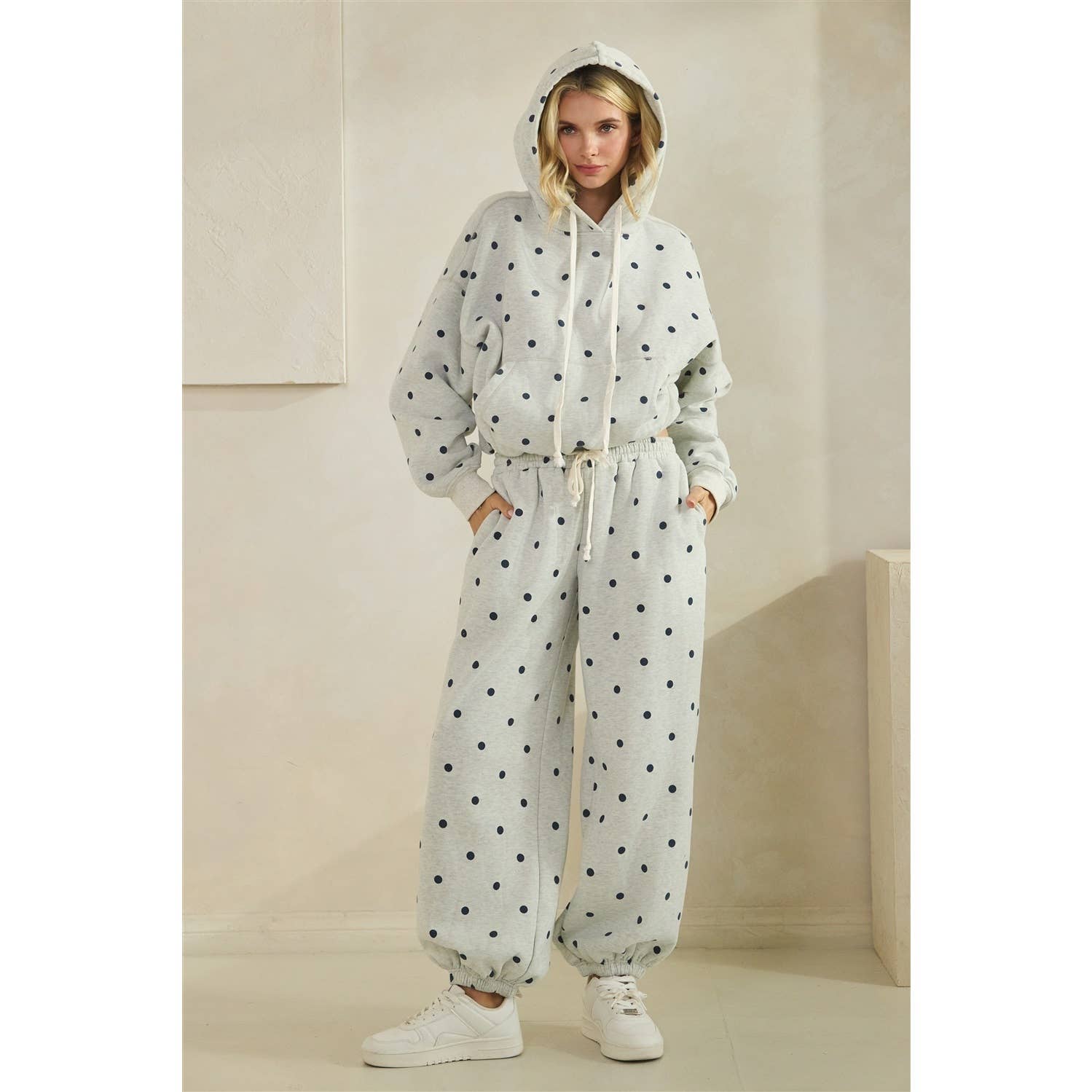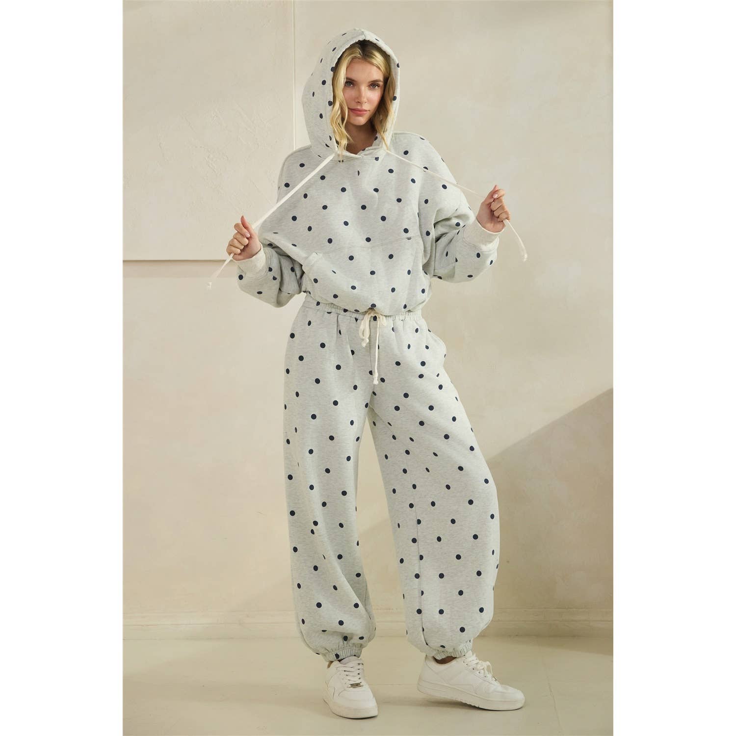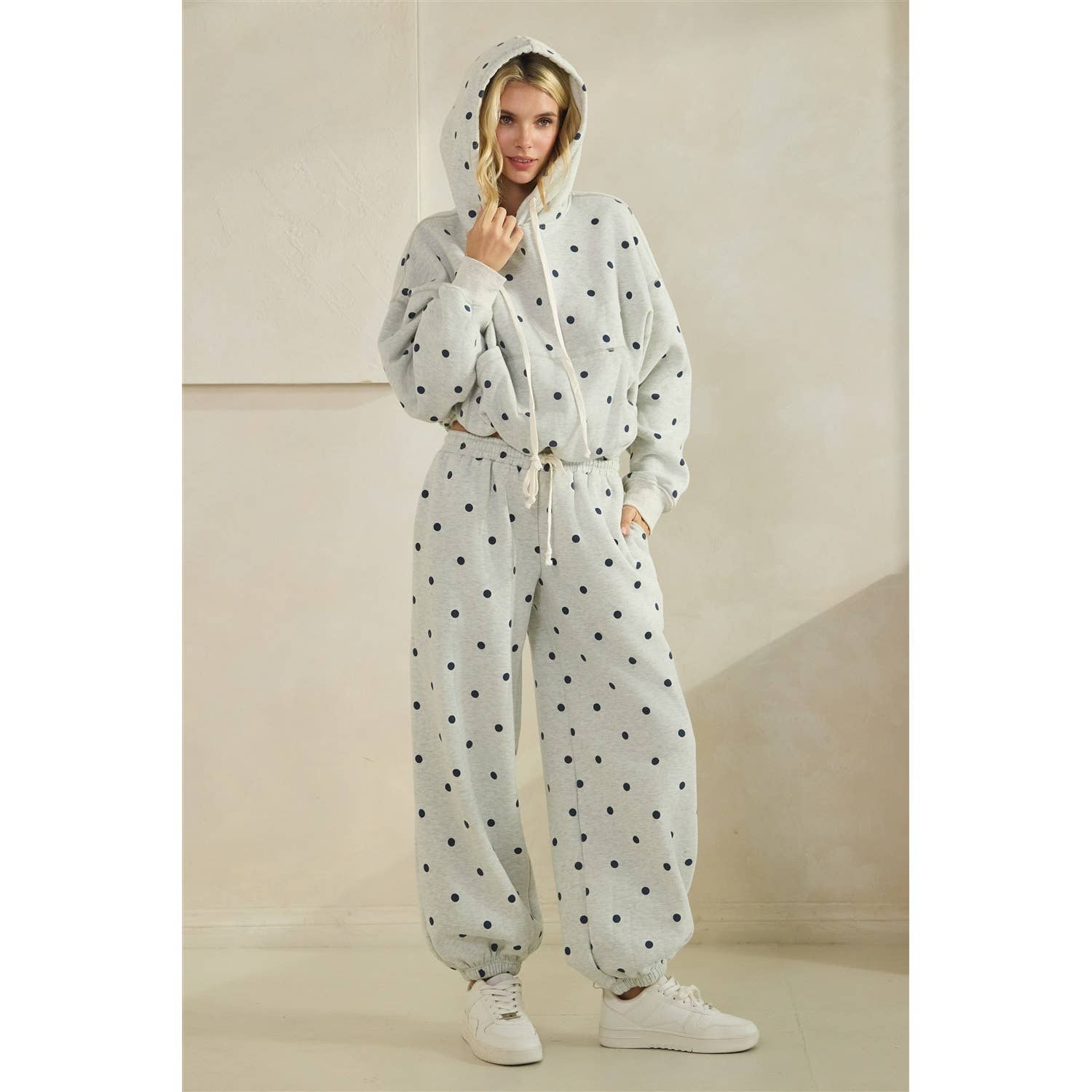 The playful polka dot print gives them that boutique, elevated look instead of basic plain sweats, so you can actually wear them out of the house without feeling sloppy. Even better paired with the matching hoodie for the cutest comfy set moment.