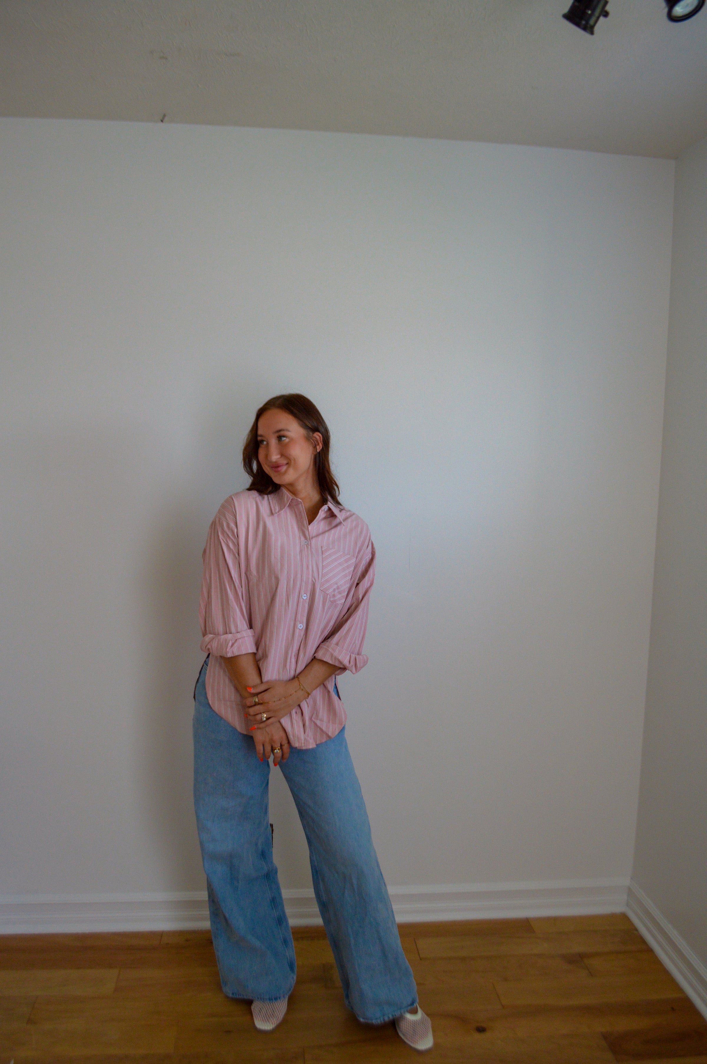 The definition of effortless chic. This striped button-down gives that borrowed-from-him vibe while still feeling polished and put-together. The lightweight woven fabric and oversized fit make it the perfect layering piece for any season.